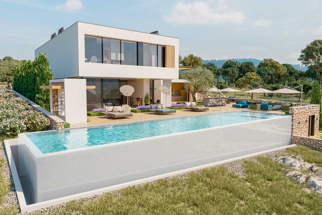 Na prostranoj terasi, u središtu vanjskog prostora, nalazi se impresivan bazen. Ovaj moderan bazen, okružen pažljivo uređenim vrtom s egzotičnim biljkama, idealan je za osvježenje tijekom vrelih ljetnih dana. Terasa je dizajnirana tako da pruža obilje sunčeve svjetlosti, dok moderna sjenila osiguravaju ugodnu hladovinu, stvarajući savršeno mjesto za druženja ili intimne trenutke.